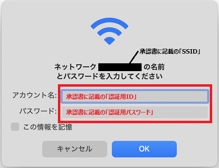 [ アカウント名 ] に承認書に記載の「認証用ID」, [ パスワード ] に承認書に記載の「認証用パスワード」を入力します.