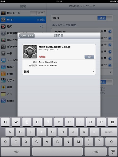 証明書の画面が表示された場合,「khan-auth3.kobe-u.ac.jp」が表示されていることを確認し,[ 了解 ]をクリックします.