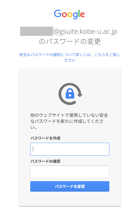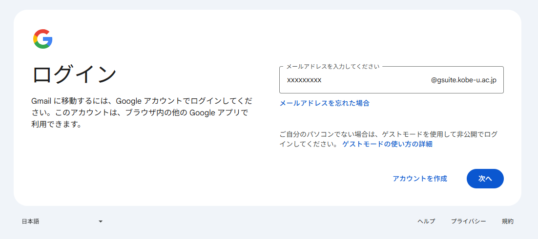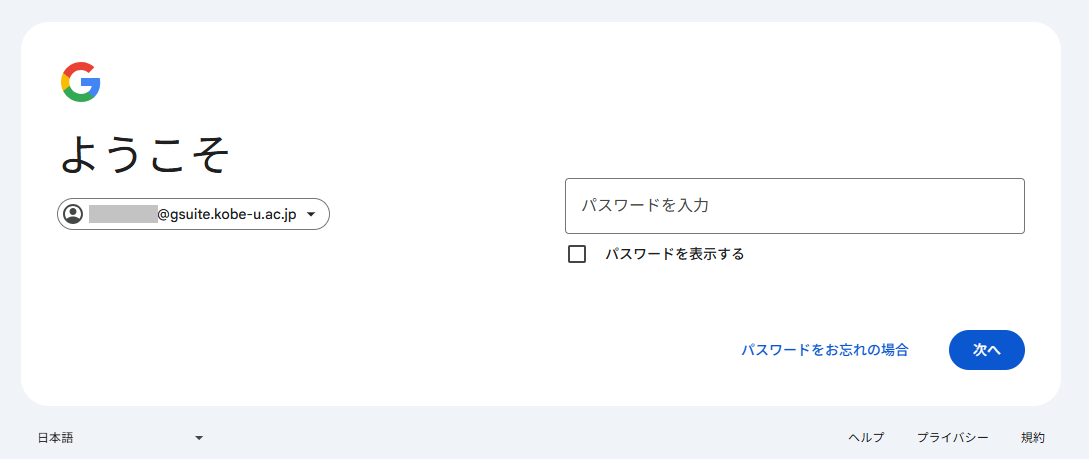 XXXXXXXX@gsuite.kobe-u.ac.jp)を入力します. - 「パスワード」に初期パスワードを入力します.