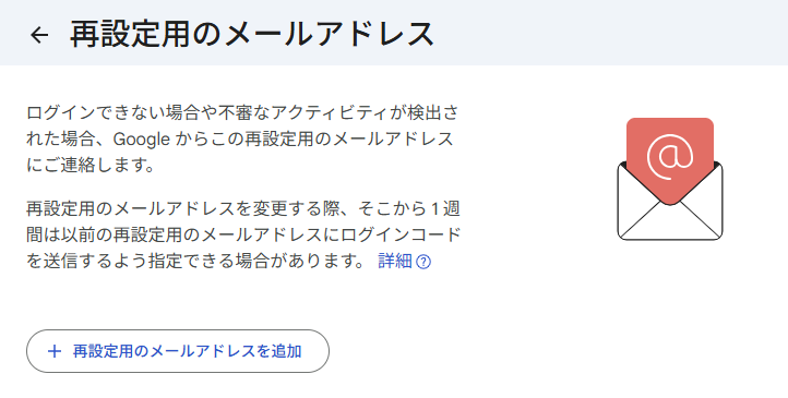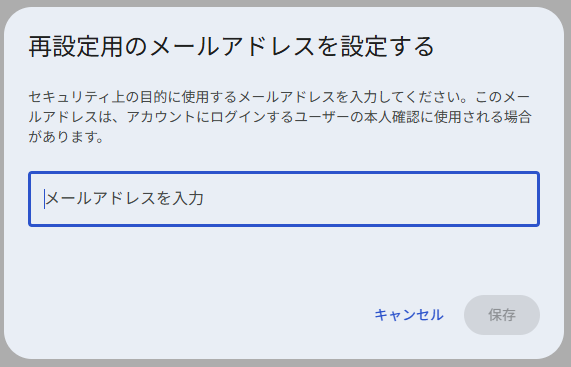 「再設定用のメールアドレスを追加」をクリックし,メールアドレスを入力し,「保存」をクリックします.いつでも確認できる 本人のメールアドレス を入力してください.- メーリングリストなど,複数人が受信するメールアドレスは指定しないでください.