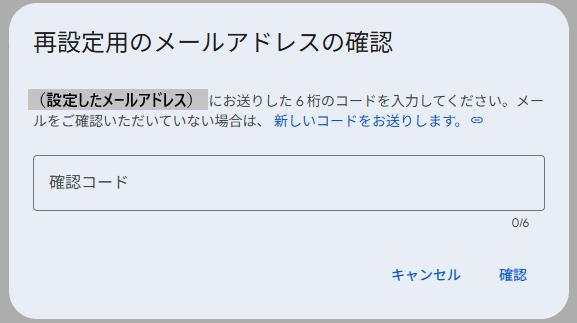 記載されている確認コードを,「再設定用のメールアドレスの確認」画面に入力し,「確認」をクリックします.