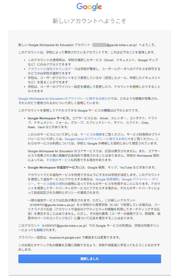 - 「新しいアカウントへようこそ」という画面が表示されます.よく読んだうえで,「理解しました」をクリックします.