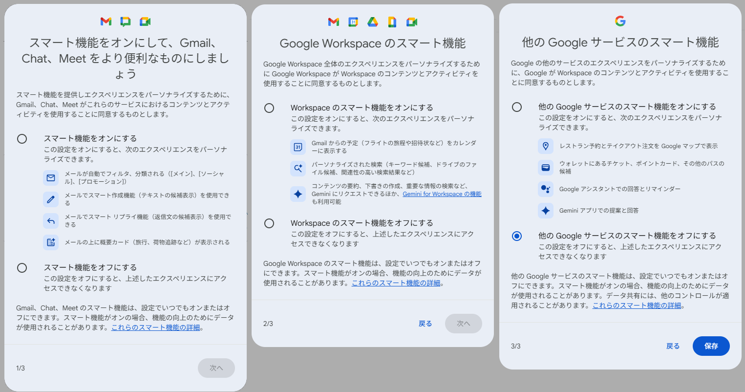 - スマート機能の案内が表示されるので,選択します.よくわからない場合は,利用開始後に設定変更できますので,ここでは「オフにする」を選択することをお勧めします.