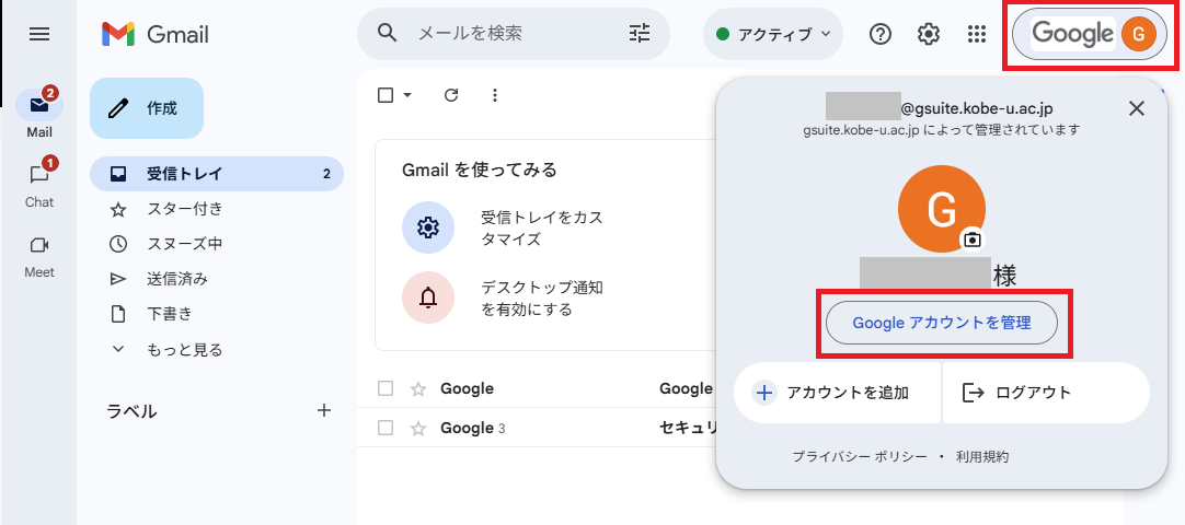 - https://accounts.google.com を開き,Google Workspaceのアカウント(@gsuite.kobe-u.ac.jp)以外のGoogleアカウントでログインしている場合はログアウトします.