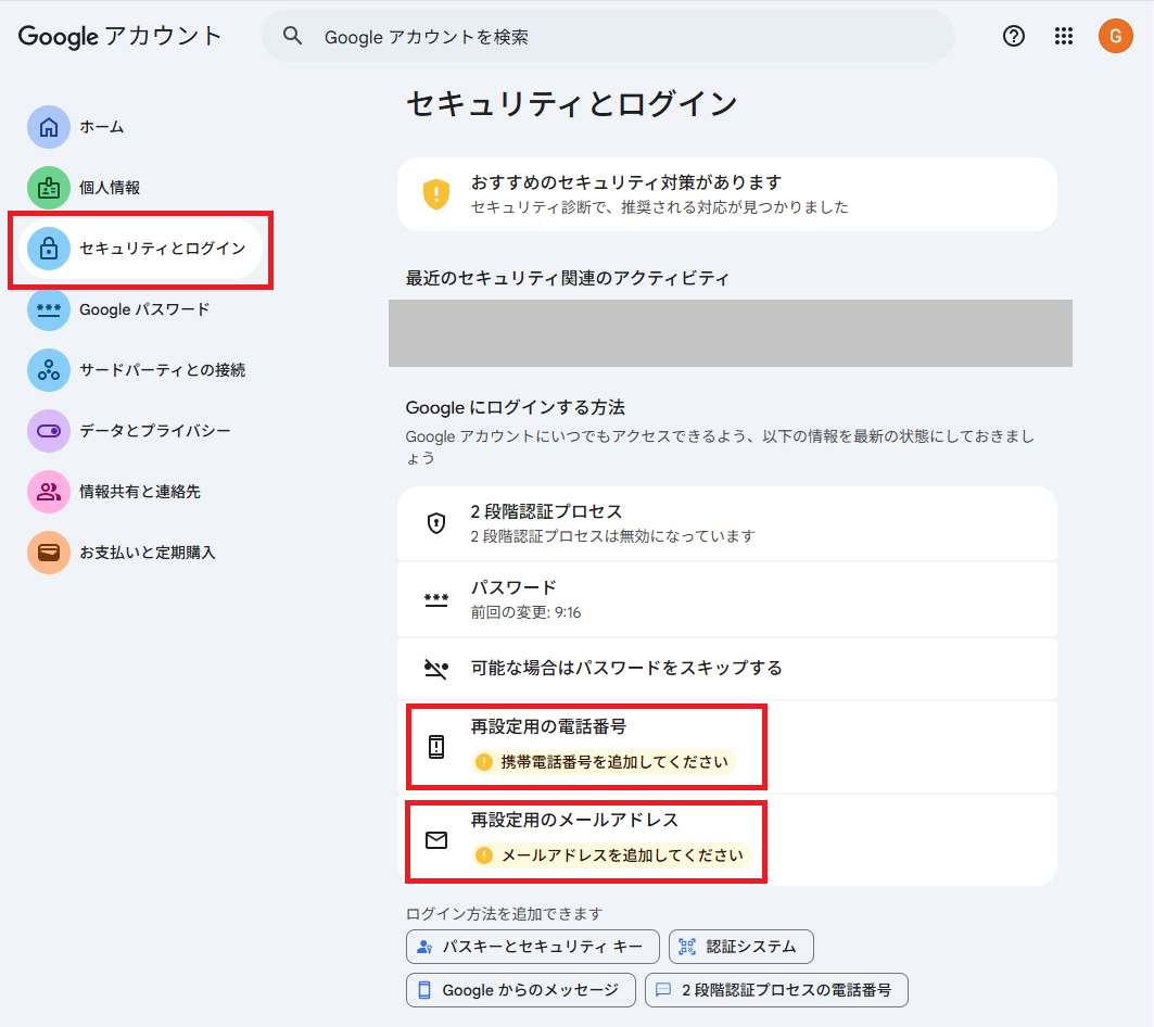 【図6】 - 「セキュリティとログイン」をクリックし,「Googleにログインする方法」の「再設定用の電話番号」と「再設定用のメールアドレス」のどちらかをクリックします.可能な限り,どちらも設定するようにしてください.